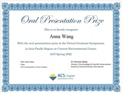 ACS美国化学会作为全球权威科学信息的主要来源,是世界上最大的科学学会之一。为全面提升青年学者的学术素养和国际化水平,ACS 2022春季年会首次增加亚太环境化学学生分会场。该会场邀请报告人均来自中国环境化学领域一流课题组的优秀学生。评委根据报告具体内容,报告呈现水平、口语和问答表现,从29位英文报告人中评出4位优秀报告奖,并颁发口头报告证书及ACS特制纪念品。