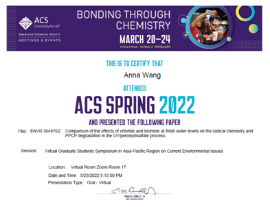 2022年3月20-24日,由美国化学会举办的ACS 2022春季线上年会圆满结束。耽美小说 方晶云教授课题组的17级博士研究生王安娜同学在亚太环境化学学生分会场做口头报告,并获得优秀报告奖。