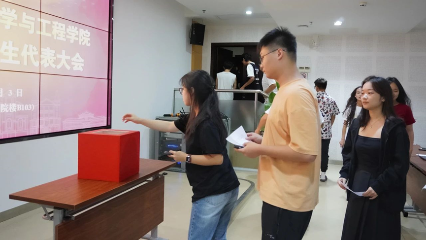 随后,进行二十三届学生会主席团成员竞选环节。候选人彭建宇、唐志强、朱璨、孙月宏四名学生会主席团候选人依次上台发表竞选演讲,表达了他们对学生会工作的热情与对未来工作的畅想,并现场回答学生代表们提出的问题。发言结束后,主持人宣读投票规则,参会同学投票选举学院第二十三届学生会主席团成员,总计票人和总监票人进行计票和监督。