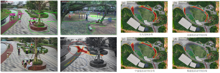 1)多源数据动态采集:在目标场地布设小型水热监测站,实时获取温度、湿度、风速等气象因子。同步利用文化服务AI智慧监测系统,集成YOLOv5行人检测与DeepSort多目标跟踪算法实现行人连续追踪,并采用SlowFast双流卷积神经网络自动识别行走、站立、锻炼等活动类型;